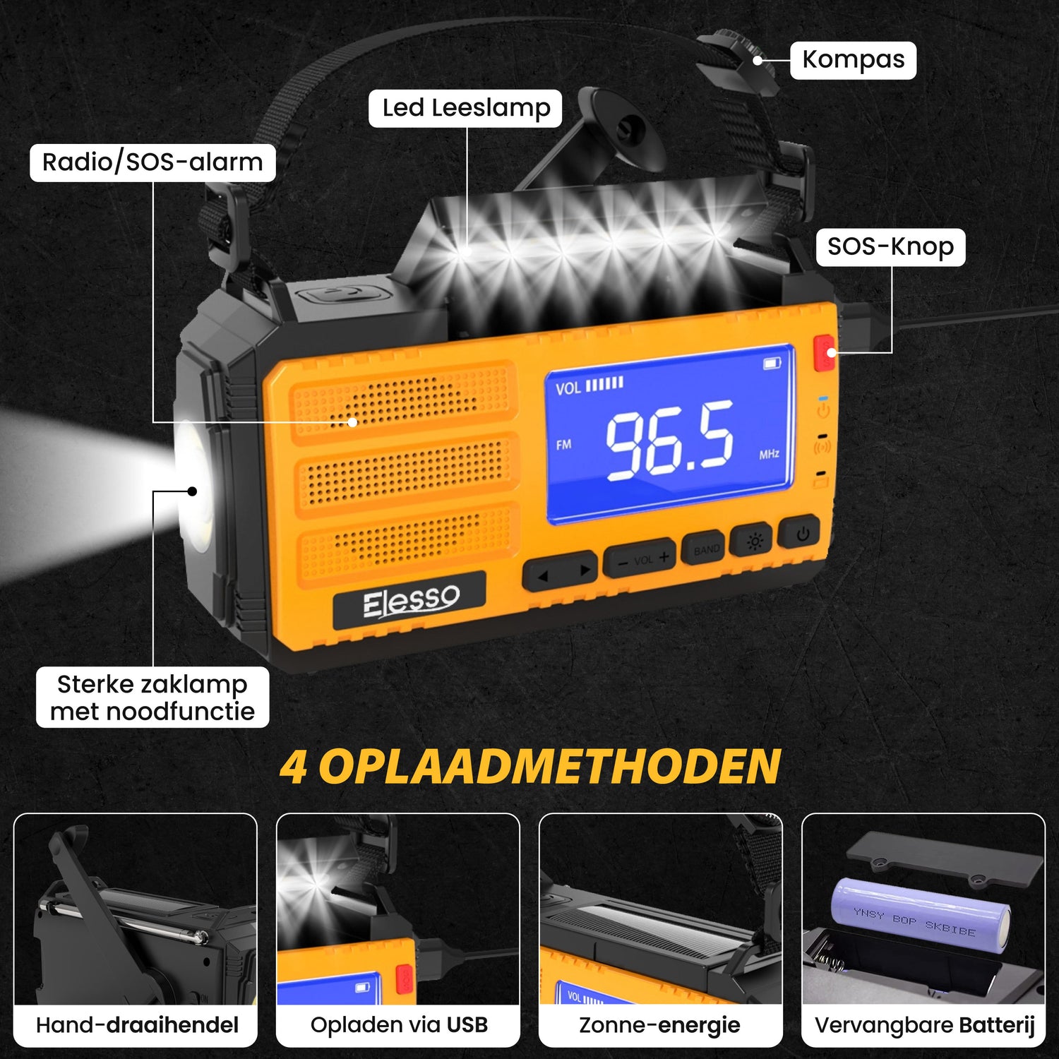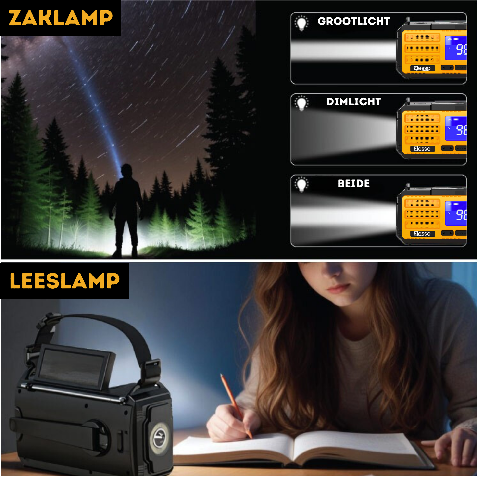 Mit dem Elesso SafeWave Notfallradio bleibst du immer verbunden. Lade dein Handy mit Solarenergie auf, und bleib auf dem Laufenden über nationales und internationales Radio für essentielle Updates. Dieses vielseitige Gerät bietet Beleuchtung, Musik, Nachrichten und ein aufgeladenes Telefon, speziell entwickelt, um dich in Notsituationen sicher und informiert zu halten.
